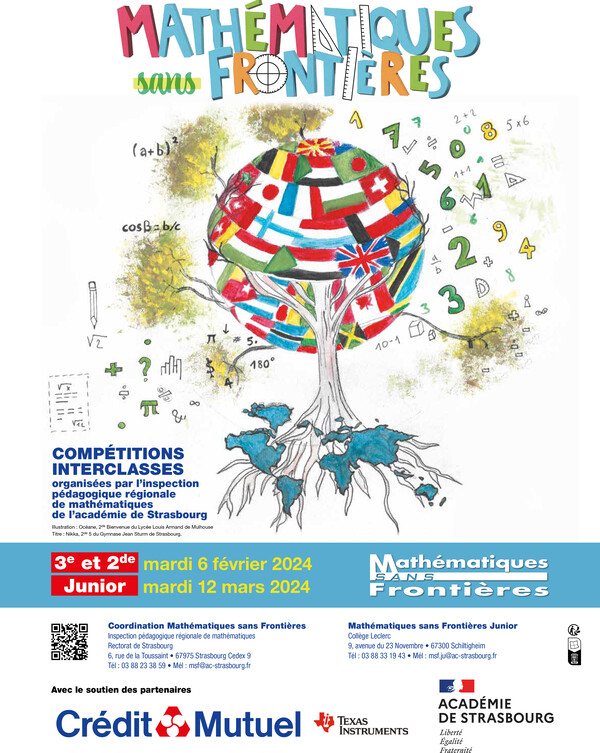 Les compétitions Mathématiques sans Frontières et Mathématiques sans Frontières Junior seront organisées le 6 février 2024. Ces compétitions sont organisées par l’inspection régionale de mathématiques de l’académie de Strasbourg.